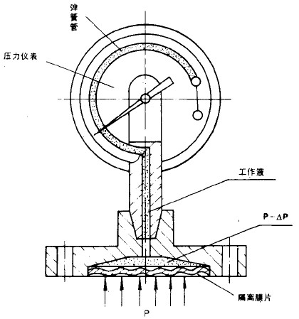 當測量介質的(de)壓力P作(zuò)用(yòng)于隔膜,則隔ε↑'膜産生(shēng)變形,壓縮壓力儀表測壓系統的(de)密封£"↑液,使其形成P-ΔP的(de)壓力。當隔膜的(de)剛性足夠小(xπσiǎo)時(shí),則ΔP也(yě)很(hěn)小(xiǎo),壓力儀表測壓系統形成的(d£↓↕♦e)壓力就(jiù)近(jìn)于測量介質的(de)壓力。